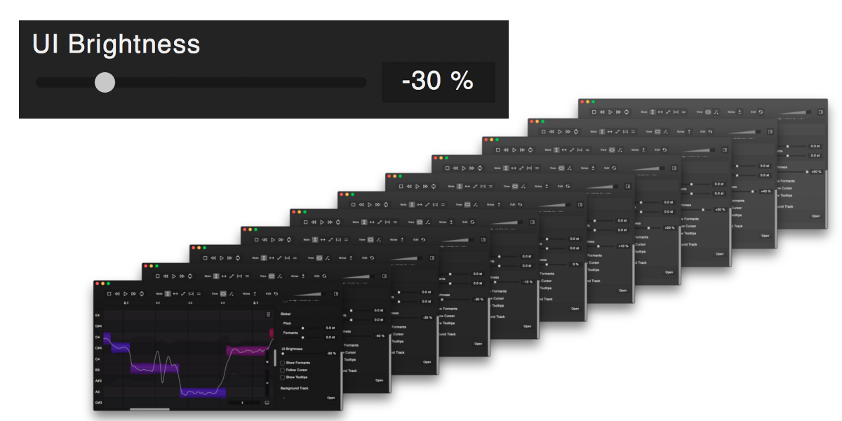 You can seamlessly adjust the UI brightness of Vovious to suit your needs at any time of the day. Nice side effect: by adjusting the brightness, you can make Vovious fit to the color of your DAW.