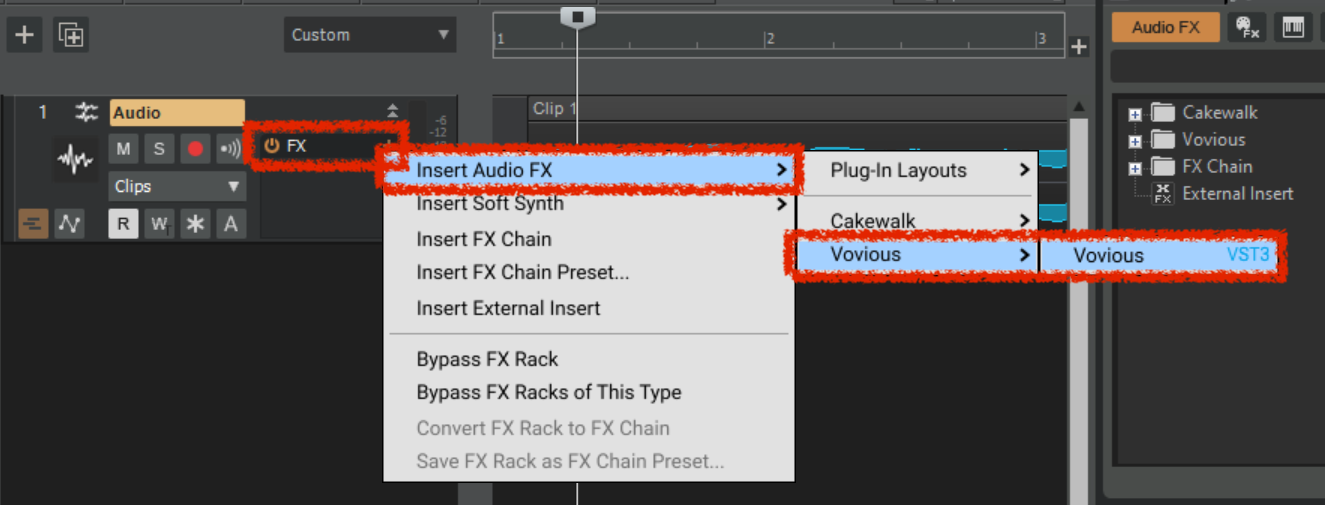 To use Vovious in Cakewalk, you have to put it in an effect slot.