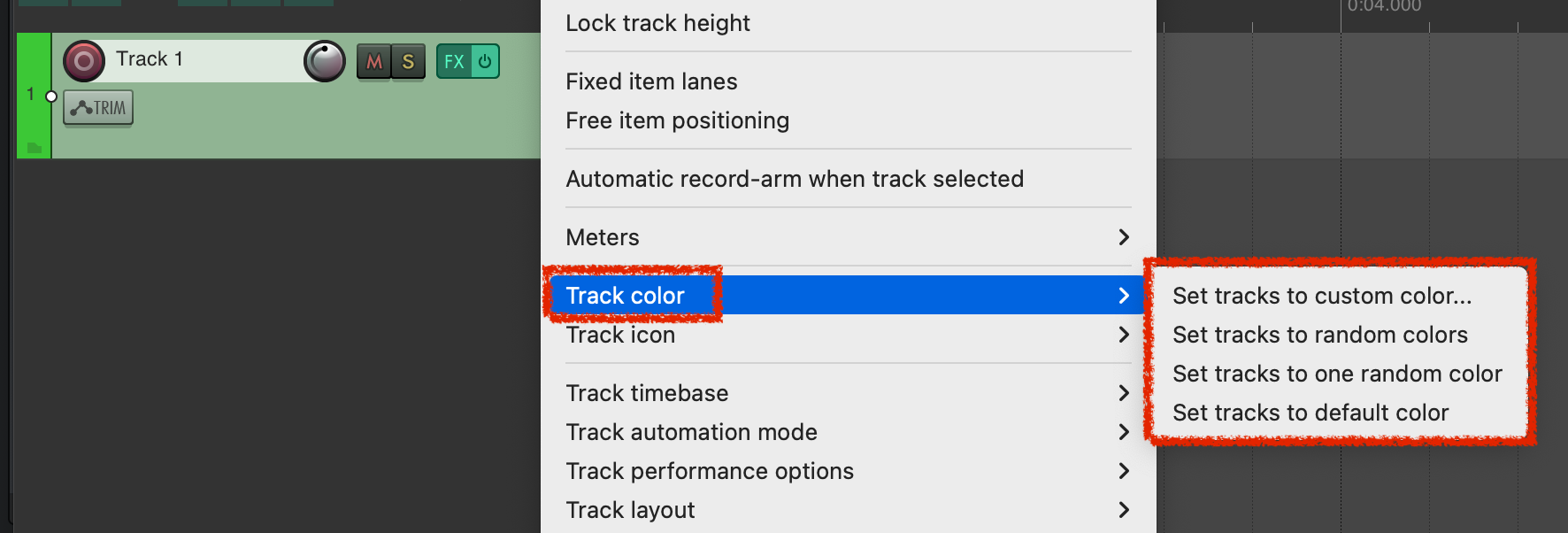 To set the track color in Reaper, use the context menu of a track (right-click) like shown below.